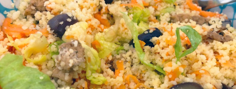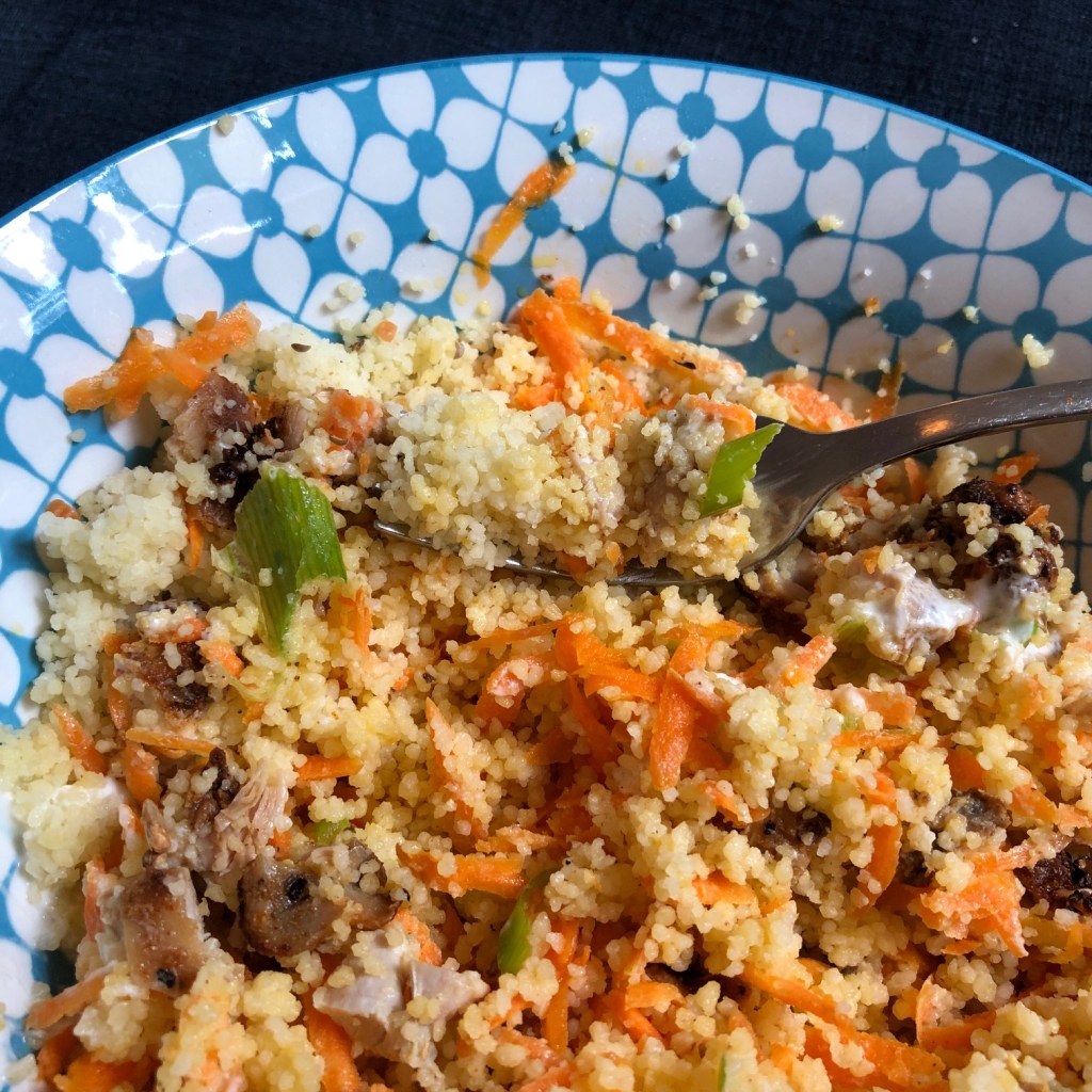 Couscous salad is a quick and simple lunch, perfect for home or a lunchbox. You can vary the ingredients based on what you have in, and it’s very useful for using up leftovers or ingredient odds and ends – that last stub of cucumber or half a carrot. Whilst it can be packed with lots of fresh salad vegetables, the couscous base is filling, so the goodness of this lunch is not undone by a circa 3pm carb-crash that can only be addressed with half a pack of ginger-nuts.